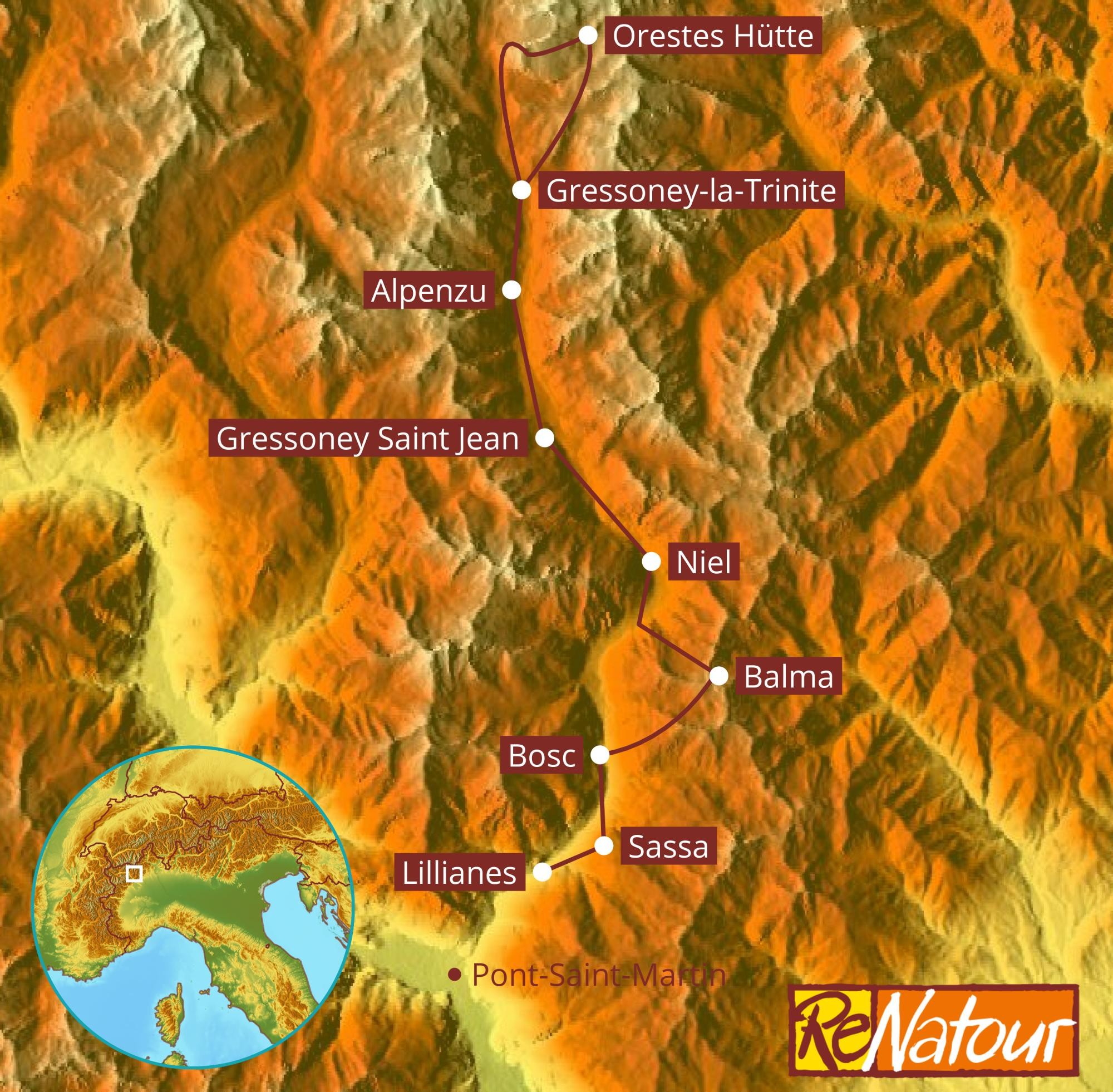 Streckenlänge via Salza-Tal : 10,0 km, Gehzeit: ca. 6:00 h, Aufstieg: 255 m, Abstieg: 1.200 mIn Gressoney-la-Trinite holen Sie Ihr Gepäck im Hotel ab und fahren mit dem Linienbus Pont-Saint-Martin - Gressoney zurück nach Lillianes (Fahrzeit ca. 60 min.) oder bis zum Bahnhof in Pont-Saint-Martin (Fahrzeit ca. 75 min.). Tickets gibt es beim Busfahrer (pro Person ca. 5 €). Gäste, die vorab in Anderbätt übernachtet haben, holen ihr Gepäck in der Pension in Anderbätt ab. Die Bushaltestelle in Anderbätt befindet sich neben der Pension (Haltestelle Orsia). Alternativ kann ein kostenpflichtiger Transfer mit Gepäcktransport zum Parkplatz in Lillianes oder Bahnhof Pont-Saint-Martin vorbestellt werden.