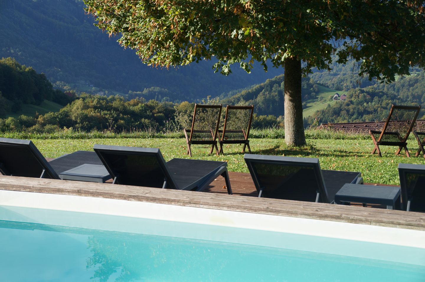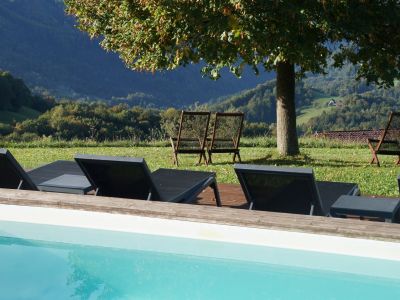 Das 5,6 Hektar große Anwesen mit Wald, Wiesen und Obstbäumen ist der ideale Ort für Familien. Einzigartig sind der malerische Obstgarten und der traumhafte Blick über die Region. Herzstück ist der Panorama-Swimmingpool, ergänzt durch Basketballplatz, Natur-Spielplatz und große Rasenfläche zum Spielen. Je nach Familienkonstellation wohnen Sie hier im "Treehouse" (bis 3 Personen) oder in einem der Appartements (ab 4 Personen).